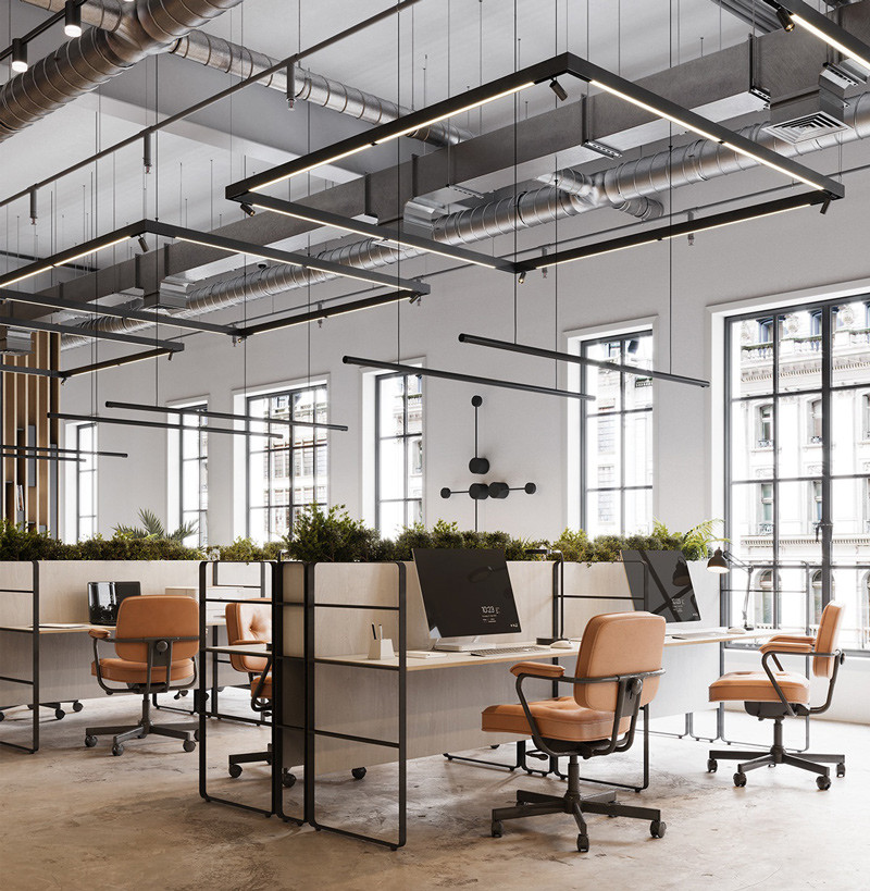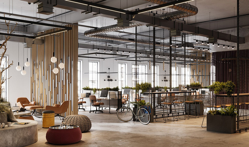 - Không gian mở & Khoáng đạt: Ưu tiên các không gian rộng lớn, thông suốt, ít vách ngăn, gợi nhớ các nhà xưởng cũ.